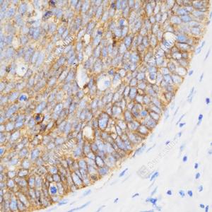 IHC检测Claudin 1蛋白(货号 GB15032). 样品: 人宫颈鳞癌, 4%多聚甲醛 (货号G1101) 固定12-24小时. 抗原修复: 柠檬酸抗原修复液(干粉, pH 6.0) (G1201), 高压锅均匀喷气计时2分钟. —抗: 1: 1000稀释, 4℃ 孵育过夜. 二抗: HRP标记山羊抗小鼠IgG (H+L) (货号GB23301), 1: 200稀释, 室温孵育1小时. |