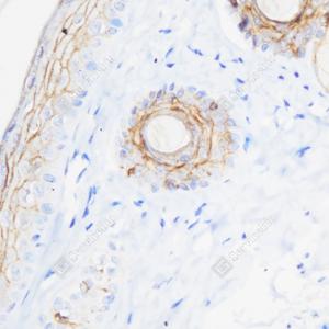 IHC检测Claudin 1蛋白(货号 GB15032). 样品: 小鼠皮肤, 4%多聚甲醛 (货号G1101) 固定12-24小时. 抗原修复: 柠檬酸抗原修复液(干粉, pH 6.0) (G1201), 高压锅均匀喷气计时2分钟. —抗: 1: 1000稀释, 4℃ 孵育过夜. 二抗: HRP标记山羊抗小鼠IgG (H+L) (货号GB23301), 1: 200稀释, 室温孵育1小时. |