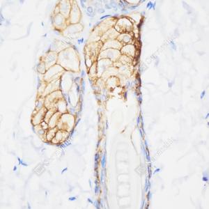 IHC检测Claudin 1蛋白(货号 GB15032). 样品: 大鼠皮肤, 4%多聚甲醛 (货号G1101) 固定12-24小时. 抗原修复: 柠檬酸抗原修复液(干粉, pH 6.0) (G1201), 高压锅均匀喷气计时2分钟. —抗: 1: 1000稀释, 4℃ 孵育过夜. 二抗: HRP标记山羊抗小鼠IgG (H+L) (货号GB23301), 1: 200稀释, 室温孵育1小时. |