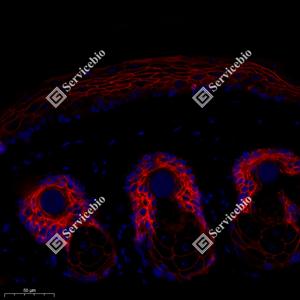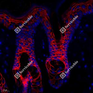 IHC检测Claudin 1蛋白(货号 GB12032). 样品: 小鼠皮肤, 4%多聚甲醛 (货号G1101) 固定12-24小时. 抗原修复: 柠檬酸抗原修复液(干粉, pH 6.0) (G1201), 高压锅均匀喷气计时2分钟. —抗: 1: 500稀释, 4℃ 孵育过夜. 二抗: HRP标记山羊抗小鼠IgG (H+L) (货号GB23301), 1: 200稀释, 室温孵育1小时. |
