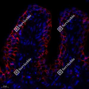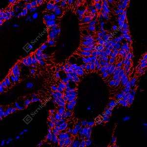 IF检测Claudin 1蛋白(货号 GB12032)(红色). 样品: 人结肠癌, 4%多聚甲醛 (货号G1101) 固定12-24小时. 抗原修复: 柠檬酸抗原修复液(干粉, pH 6.0) (G1201), 高压锅均匀喷气计时2分钟. 封闭: 3% BSA(货号GC305010)的PBS溶液, 室温孵育30分钟. —抗: 1: 500稀释, 4℃ 孵育过夜. 二抗: Cy3标记山羊抗小鼠IgG (H+L) (货号GB21301), 1: 300稀释, 室温孵育1小时. |