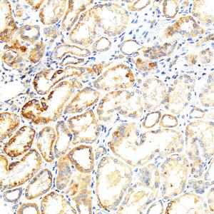 IHC检测Beclin 1蛋白(货号 GB115741). 样品: 人肾, 4%多聚甲醛 (货号G1101) 固定12-24小时. 抗原修复: 柠檬酸抗原修复液(干粉, pH 6.0) (G1201), 98℃, 20分钟. —抗: 1: 600稀释, 4℃ 孵育过夜. 二抗: S-vision免疫组化多聚二抗(山羊抗兔),即用型 (货号G1302), 室温孵育20分钟. |
