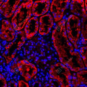 IF检测Beclin 1蛋白(货号 GB115741)(红色). 样品: 人肾, 4%多聚甲醛 (货号G1101) 固定12-24小时. 抗原修复: Tris-EDTA抗原修复液(pH 9.0) (G1203), 98℃, 20分钟. 封闭: 3% BSA(货号GC305010)的PBS溶液, 室温孵育30分钟. —抗: 1: 600稀释, 4℃ 孵育过夜. 二抗: Cy3标记山羊抗兔IgG (H+L) (货号GB21303), 1: 300稀释, 室温孵育1小时. |
