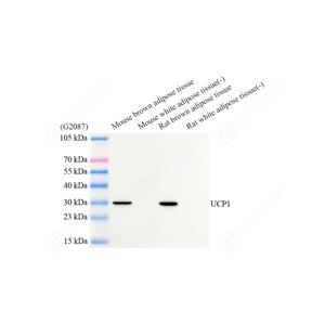 | WB检测UCP1蛋白(货号 GB152174). 样品: 经RIPA裂解液(货号G2002)处理的蛋白质. 封闭: 3%脱脂牛奶(货号GC310001)溶于TBST溶液, 室温孵育1小时. —抗: 1: 1000稀释, 4℃ 孵育过夜. 二抗: HRP标记山羊抗兔IgG (H+L) (货号GB23303), 1: 5000稀释, 室温孵育1小时. |