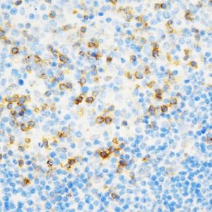 IHC检测PD1蛋白(货号 GB15338). 样品: 人扁桃体, 4%多聚甲醛 (货号G1101) 固定12-24小时. 抗原修复: 柠檬酸抗原修复液(干粉, pH 6.0) (G1201), 高压锅均匀喷气计时2分钟. —抗: 1: 1000稀释, 4℃ 孵育过夜. 二抗: HRP标记山羊抗小鼠IgG (H+L) (货号GB23301), 1: 200稀释, 室温孵育1小时. |