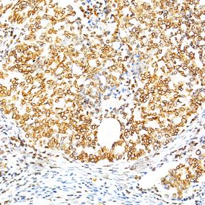 IHC检测Lamin B1蛋白(货号 GB115748). 样品: 人卵巢癌, 4%多聚甲醛 (货号G1101) 固定12-24小时. 抗原修复: 柠檬酸抗原修复液(干粉, pH 6.0) (G1201), 98℃, 20分钟. —抗: 1: 1200稀释, 4℃ 孵育过夜. 二抗: S-vision免疫组化多聚二抗(山羊抗兔),即用型 (货号G1302), 室温孵育20分钟. |