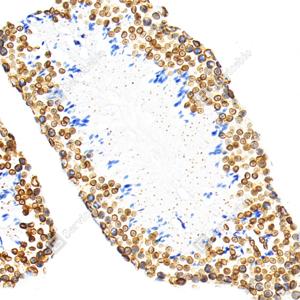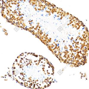 IHC检测Lamin B1蛋白(货号 GB115748). 样品: 小鼠睾丸, 4%多聚甲醛 (货号G1101) 固定12-24小时. 抗原修复: 柠檬酸抗原修复液(干粉, pH 6.0) (G1201), 98℃, 20分钟. —抗: 1: 1200稀释, 4℃ 孵育过夜. 二抗: S-vision免疫组化多聚二抗(山羊抗兔),即用型 (货号G1302), 室温孵育20分钟. |
