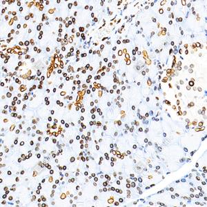 IHC检测Lamin B1蛋白(货号 GB115748). 样品: 大鼠肾, 4%多聚甲醛 (货号G1101) 固定12-24小时. 抗原修复: 柠檬酸抗原修复液(干粉, pH 6.0) (G1201), 98℃, 20分钟. —抗: 1: 1200稀释, 4℃ 孵育过夜. 二抗: S-vision免疫组化多聚二抗(山羊抗兔),即用型 (货号G1302), 室温孵育20分钟. |