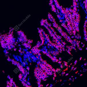 IF检测Lamin B1蛋白(货号 GB115748)(红色). 样品: 小鼠小肠, 4%多聚甲醛 (货号G1101) 固定12-24小时. 抗原修复: Tris-EDTA抗原修复液(pH 9.0) (G1203), 98℃, 20分钟. 封闭: 3% BSA(货号GC305010)的PBS溶液, 室温孵育30分钟. —抗: 1: 900稀释, 4℃ 孵育过夜. 二抗: Cy3标记山羊抗兔IgG (H+L) (货号GB21303), 1: 300稀释, 室温孵育1小时. |