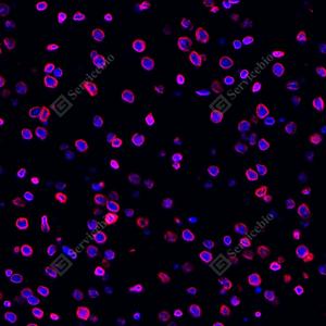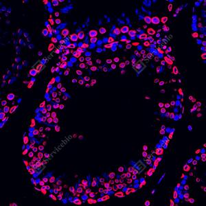 IF检测Lamin B1蛋白(货号 GB115748)(红色). 样品: 大鼠睾丸, 4%多聚甲醛 (货号G1101) 固定12-24小时. 抗原修复: Tris-EDTA抗原修复液(pH 9.0) (G1203), 98℃, 20分钟. 封闭: 3% BSA(货号GC305010)的PBS溶液, 室温孵育30分钟. —抗: 1: 900稀释, 4℃ 孵育过夜. 二抗: Cy3标记山羊抗兔IgG (H+L) (货号GB21303), 1: 300稀释, 室温孵育1小时. |