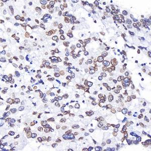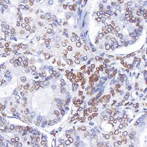 IHC检测Lamin B1蛋白(货号 GB115715). 样品: 人子宫内膜癌, 4%多聚甲醛 (货号G1101) 固定12-24小时. 抗原修复: Tris-EDTA抗原修复液(pH 9.0) (G1203), 98℃, 20分钟. —抗: 1: 300稀释, 4℃ 孵育过夜. 二抗: S-vision免疫组化多聚二抗(山羊抗兔),即用型 (货号G1302), 室温孵育20分钟. |