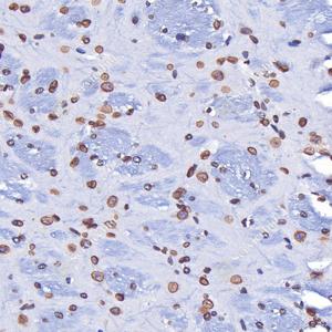 IHC检测Lamin B1蛋白(货号 GB115715). 样品: 人卵巢癌, 4%多聚甲醛 (货号G1101) 固定12-24小时. 抗原修复: Tris-EDTA抗原修复液(pH 9.0) (G1203), 98℃, 20分钟. —抗: 1: 300稀释, 4℃ 孵育过夜. 二抗: S-vision免疫组化多聚二抗(山羊抗兔),即用型 (货号G1302), 室温孵育20分钟. |