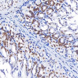 IHC检测Lamin B1蛋白(货号 GB115715). 样品: 小鼠胃, 4%多聚甲醛 (货号G1101) 固定12-24小时. 抗原修复: Tris-EDTA抗原修复液(pH 9.0) (G1203), 98℃, 20分钟. —抗: 1: 300稀释, 4℃ 孵育过夜. 二抗: S-vision免疫组化多聚二抗(山羊抗兔),即用型 (货号G1302), 室温孵育20分钟. |