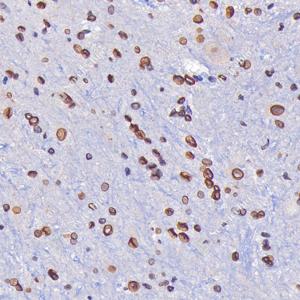 IHC检测Lamin B1蛋白(货号 GB115715). 样品: 大鼠脊髓, 4%多聚甲醛 (货号G1101) 固定12-24小时. 抗原修复: Tris-EDTA抗原修复液(pH 9.0) (G1203), 98℃, 20分钟. —抗: 1: 300稀释, 4℃ 孵育过夜. 二抗: S-vision免疫组化多聚二抗(山羊抗兔),即用型 (货号G1302), 室温孵育20分钟. |