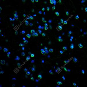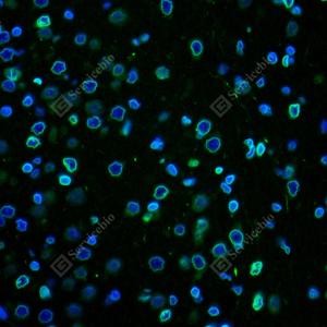 IF检测Lamin B1蛋白(货号 GB115715)(绿色). 样品: 大鼠脑, 4%多聚甲醛 (货号G1101) 固定12-24小时. 抗原修复: Tris-EDTA抗原修复液(pH 9.0) (G1203), 98℃, 20分钟. 封闭: 3% BSA(货号GC305010)的PBS溶液, 室温孵育30分钟. —抗: 1: 200稀释, 4℃ 孵育过夜. 二抗: Alexa Fluor 488标记山羊抗兔IgG (H+L) (货号GB25303), 1: 400稀释, 室温孵育1小时. |