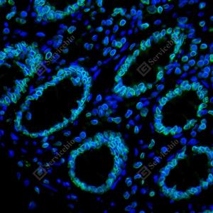 IF检测Lamin B1蛋白(货号 GB115715)(绿色). 样品: 人结肠, 4%多聚甲醛 (货号G1101) 固定12-24小时. 抗原修复: Tris-EDTA抗原修复液(pH 9.0) (G1203), 98℃, 20分钟. 封闭: 3% BSA(货号GC305010)的PBS溶液, 室温孵育30分钟. —抗: 1: 200稀释, 4℃ 孵育过夜. 二抗: Alexa Fluor 488标记山羊抗兔IgG (H+L) (货号GB25303), 1: 400稀释, 室温孵育1小时. |