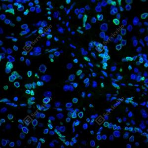 IF检测Lamin B1蛋白(货号 GB115715)(绿色). 样品: 人肾癌, 4%多聚甲醛 (货号G1101) 固定12-24小时. 抗原修复: Tris-EDTA抗原修复液(pH 9.0) (G1203), 98℃, 20分钟. 封闭: 3% BSA(货号GC305010)的PBS溶液, 室温孵育30分钟. —抗: 1: 200稀释, 4℃ 孵育过夜. 二抗: Alexa Fluor 488标记山羊抗兔IgG (H+L) (货号GB25303), 1: 400稀释, 室温孵育1小时. |