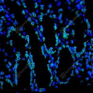IF检测Lamin B1蛋白(货号 GB115715)(绿色). 样品: 人胃, 4%多聚甲醛 (货号G1101) 固定12-24小时. 抗原修复: Tris-EDTA抗原修复液(pH 9.0) (G1203), 98℃, 20分钟. 封闭: 3% BSA(货号GC305010)的PBS溶液, 室温孵育30分钟. —抗: 1: 200稀释, 4℃ 孵育过夜. 二抗: Alexa Fluor 488标记山羊抗兔IgG (H+L) (货号GB25303), 1: 400稀释, 室温孵育1小时. |