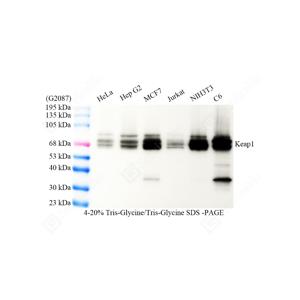 WB检测Keap1蛋白(货号 GB153747). 样品: 经RIPA裂解液(货号G2002)处理的蛋白质. 封闭: 3%脱脂牛奶(货号GC310001)溶于TBST溶液, 室温孵育1小时. —抗: 1: 1000稀释, 4℃ 孵育过夜. 二抗: HRP标记山羊抗兔IgG (H+L) (货号GB23303), 1: 5000稀释, 室温孵育1小时. |