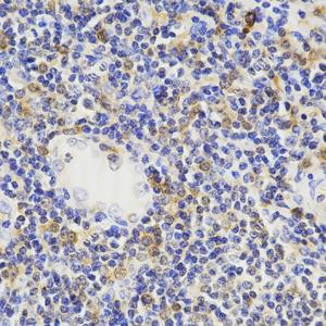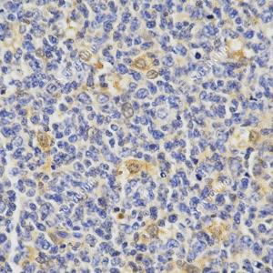 IHC检测TMS1/ASC蛋白(货号 GB115270). 样品: 人扁桃体, 4%多聚甲醛 (货号G1101) 固定12-24小时. 抗原修复: 柠檬酸抗原修复液(干粉, pH 6.0) (G1201), 98℃, 20分钟. —抗: 1: 600稀释, 4℃ 孵育过夜. 二抗: HRP标记山羊抗兔IgG (H+L) (货号GB23303), 1: 200稀释, 室温孵育1小时. |