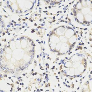 IHC检测TMS1/ASC蛋白(货号 GB115270). 样品: 人结肠, 4%多聚甲醛 (货号G1101) 固定12-24小时. 抗原修复: 柠檬酸抗原修复液(干粉, pH 6.0) (G1201), 98℃, 20分钟. —抗: 1: 600稀释, 4℃ 孵育过夜. 二抗: HRP标记山羊抗兔IgG (H+L) (货号GB23303), 1: 200稀释, 室温孵育1小时. |