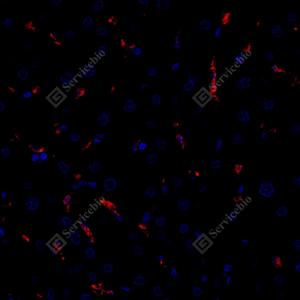 IF检测TMS1/ASC蛋白(货号 GB115270)(红色). 样品: 人肝, 4%多聚甲醛 (货号G1101) 固定12-24小时. 抗原修复: Tris-EDTA抗原修复液(pH 9.0) (G1203), 98℃, 20分钟. 封闭: 3% BSA(货号GC305010)的PBS溶液, 室温孵育30分钟. —抗: 1: 400稀释, 4℃ 孵育过夜. 二抗: Cy3标记山羊抗兔IgG (H+L) (货号GB21303), 1: 300稀释, 室温孵育1小时. |