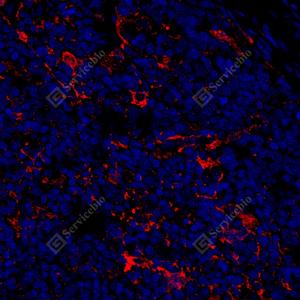 IF检测TMS1/ASC蛋白(货号 GB115270)(红色). 样品: 人扁桃体, 4%多聚甲醛 (货号G1101) 固定12-24小时. 抗原修复: Tris-EDTA抗原修复液(pH 9.0) (G1203), 98℃, 20分钟. 封闭: 3% BSA(货号GC305010)的PBS溶液, 室温孵育30分钟. —抗: 1: 400稀释, 4℃ 孵育过夜. 二抗: Cy3标记山羊抗兔IgG (H+L) (货号GB21303), 1: 300稀释, 室温孵育1小时. |