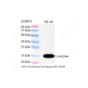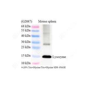 | WB检测Lysozyme蛋白(货号 GB152948). 样品: 经RIPA裂解液(货号G2002)处理的蛋白质. 封闭: 3%脱脂牛奶(货号GC310001)溶于TBST溶液, 室温孵育1小时. —抗: 1: 1000稀释, 4℃ 孵育过夜. 二抗: HRP标记山羊抗小鼠IgG (H+L) (货号GB23301), 1: 5000稀释, 室温孵育1小时. |