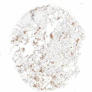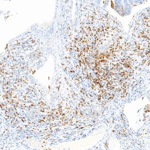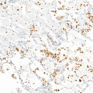 | IHC检测Lysozyme蛋白(货号 GB152948). 样品: 人肺, 4%多聚甲醛 (货号G1101) 固定12-24小时. 抗原修复: Tris-EDTA抗原修复液(pH 9.0) (G1203), 100℃, 25分钟. —抗: 1: 1000稀释, 4℃ 孵育过夜. 二抗: S-vision免疫组化多聚二抗(山羊抗小鼠), 即用型(货号G1301), 室温孵育20分钟. |