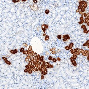 | IHC检测Lysozyme蛋白(货号 GB152948). 样品: 小鼠肾, 4%多聚甲醛 (货号G1101) 固定12-24小时. 抗原修复: Tris-EDTA抗原修复液(pH 9.0) (G1203), 100℃, 25分钟. —抗: 1: 1000稀释, 4℃ 孵育过夜. 二抗: S-vision免疫组化多聚二抗(山羊抗小鼠), 即用型(货号G1301), 室温孵育20分钟. |