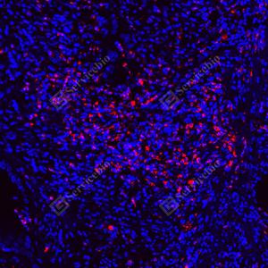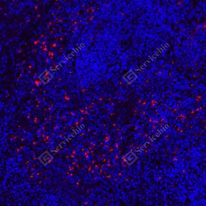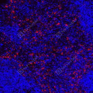 | IF检测Lysozyme蛋白(货号 GB152948)(红色). 样品: 大鼠脾, 4%多聚甲醛 (货号G1101) 固定12-24小时. 抗原修复: Tris-EDTA抗原修复液(pH 9.0) (G1203), 100℃, 25分钟. 封闭: 3% BSA(货号GC305010)的PBS溶液, 室温孵育30分钟. —抗: 1: 1000稀释, 4℃ 孵育过夜. 二抗: Cy3标记山羊抗小鼠IgG (H+L) (货号GB21301), 1: 300稀释, 室温孵育1小时. |