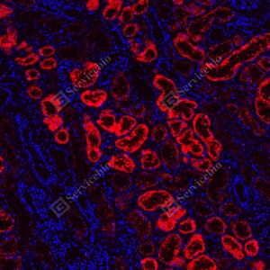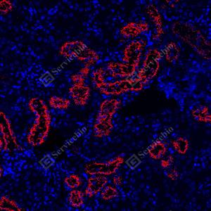 | IF检测Lysozyme蛋白(货号 GB152948)(红色). 样品: 人肾, 4%多聚甲醛 (货号G1101) 固定12-24小时. 抗原修复: Tris-EDTA抗原修复液(pH 9.0) (G1203), 100℃, 25分钟. 封闭: 3% BSA(货号GC305010)的PBS溶液, 室温孵育30分钟. —抗: 1: 1000稀释, 4℃ 孵育过夜. 二抗: Cy3标记山羊抗小鼠IgG (H+L) (货号GB21301), 1: 300稀释, 室温孵育1小时. |
