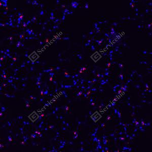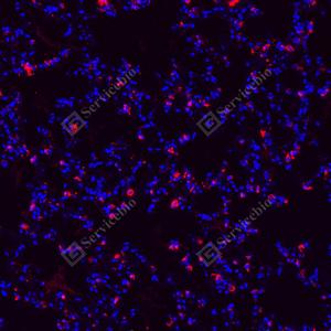 | IF检测Lysozyme蛋白(货号 GB152948)(红色). 样品: 小鼠肺, 4%多聚甲醛 (货号G1101) 固定12-24小时. 抗原修复: Tris-EDTA抗原修复液(pH 9.0) (G1203), 100℃, 25分钟. 封闭: 3% BSA(货号GC305010)的PBS溶液, 室温孵育30分钟. —抗: 1: 1000稀释, 4℃ 孵育过夜. 二抗: Cy3标记山羊抗小鼠IgG (H+L) (货号GB21301), 1: 300稀释, 室温孵育1小时. |