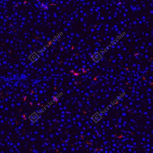 | IF检测Lysozyme蛋白(货号 GB152948)(红色). 样品: 人肝, 4%多聚甲醛 (货号G1101) 固定12-24小时. 抗原修复: Tris-EDTA抗原修复液(pH 9.0) (G1203), 100℃, 25分钟. 封闭: 3% BSA(货号GC305010)的PBS溶液, 室温孵育30分钟. —抗: 1: 1000稀释, 4℃ 孵育过夜. 二抗: Cy3标记山羊抗小鼠IgG (H+L) (货号GB21301), 1: 300稀释, 室温孵育1小时. |