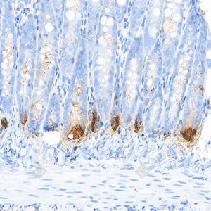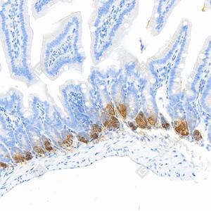 | IHC检测Lysozyme蛋白(货号 GB152948). 样品: 小鼠小肠, 4%多聚甲醛 (货号G1101) 固定12-24小时. 抗原修复: Tris-EDTA抗原修复液(pH 9.0) (G1203), 100℃, 25分钟. —抗: 1: 1000稀释, 4℃ 孵育过夜. 二抗: S-vision免疫组化多聚二抗(山羊抗小鼠), 即用型(货号G1301), 室温孵育20分钟. |
