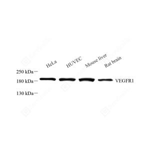 WB检测VEGF Receptor 1蛋白(货号 GB114200). 样品: 经RIPA裂解液(货号G2002)处理的蛋白质. 封闭: 封闭: 3%脱脂牛奶(货号GC310001)溶于TBST溶液, 室温孵育1小时. —抗: 1: 400稀释, 4℃ 孵育过夜. 二抗: HRP标记山羊抗兔IgG (H+L) (货号GB23303), 1: 5000稀释, 室温孵育1小时. |