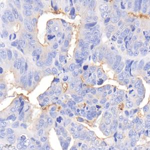 | IHC检测CD133蛋白(货号 GB114579). 样品: 人结肠癌, 4%多聚甲醛 (货号G1101) 固定12-24小时. 抗原修复: 柠檬酸抗原修复液(干粉, pH 6.0) (G1201), 98℃, 20分钟. —抗: 1: 800稀释, 4℃ 孵育过夜. 二抗: HRP标记山羊抗兔IgG (H+L) (货号GB23303), 1: 200稀释, 室温孵育1小时. |