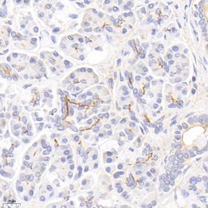 | IHC检测CD133蛋白(货号 GB114579). 样品: 人胰腺, 4%多聚甲醛 (货号G1101) 固定12-24小时. 抗原修复: 柠檬酸抗原修复液(干粉, pH 6.0) (G1201), 98℃, 20分钟. —抗: 1: 800稀释, 4℃ 孵育过夜. 二抗: HRP标记山羊抗兔IgG (H+L) (货号GB23303), 1: 200稀释, 室温孵育1小时. |