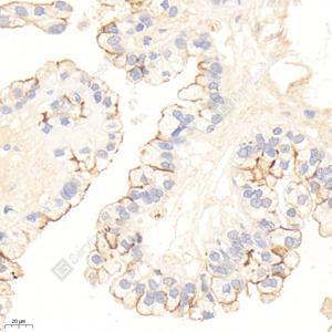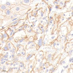 | IHC检测CD133蛋白(货号 GB114579). 样品: 人肾癌, 4%多聚甲醛 (货号G1101) 固定12-24小时. 抗原修复: 柠檬酸抗原修复液(干粉, pH 6.0) (G1201), 98℃, 20分钟. —抗: 1: 800稀释, 4℃ 孵育过夜. 二抗: HRP标记山羊抗兔IgG (H+L) (货号GB23303), 1: 200稀释, 室温孵育1小时. |