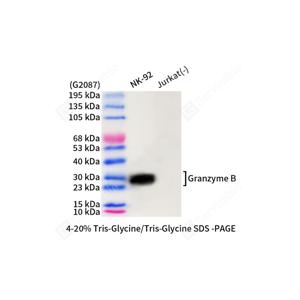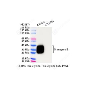 | WB检测Granzyme B蛋白(货号 GB150173) . 样品: 经RIPA裂解液(货号G2002)处理的蛋白质. 封闭: 3%脱脂牛奶(货号GC310001)溶于TBST溶液, 室温孵育1小时. —抗: 1: 500稀释, 4℃ 孵育过夜. 二抗: HRP标记山羊抗兔IgG (H+L) (货号GB23303), 1: 5000稀释, 室温孵育1小时. |
