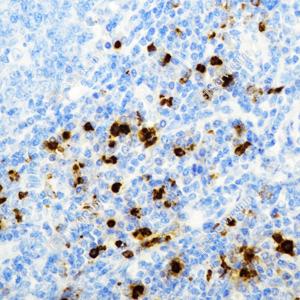 IHC检测Granzyme B蛋白(货号 GB15092). 样品: 人扁桃体, 4%多聚甲醛 (货号G1101) 固定12-24小时. 抗原修复: 柠檬酸抗原修复液(干粉, pH 6.0) (G1201), 高压锅均匀喷气计时2分钟. —抗: 1: 1000稀释, 4℃ 孵育过夜. 二抗: HRP标记山羊抗小鼠IgG (H+L) (货号GB23301), 1: 200稀释, 室温孵育1小时. |