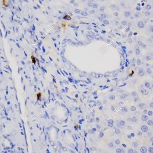 IHC检测Granzyme B蛋白(货号 GB15093). 样品: 大鼠LPS诱导(6h)肝脏炎症模型, 4%多聚甲醛 (货号G1101) 固定12-24小时. 抗原修复: 柠檬酸抗原修复液(干粉, pH 6.0) (G1201), 高压锅均匀喷气计时2分钟. —抗: 1: 500稀释, 4℃ 孵育过夜. 二抗: HRP标记山羊抗小鼠IgG (H+L) (货号GB23301), 1: 200稀释, 室温孵育1小时. |