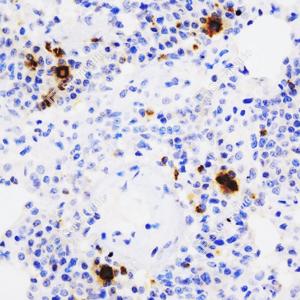 IHC检测Granzyme B蛋白(货号 GB15093). 样品: 大鼠抗原刺激肺部模型, 4%多聚甲醛 (货号G1101) 固定12-24小时. 抗原修复: 柠檬酸抗原修复液(干粉, pH 6.0) (G1201), 高压锅均匀喷气计时2分钟. —抗: 1: 500稀释, 4℃ 孵育过夜. 二抗: HRP标记山羊抗小鼠IgG (H+L) (货号GB23301), 1: 200稀释, 室温孵育1小时. |