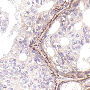 | IHC检测Integrin beta 1蛋白(货号 GB115173). 样品: 人平滑肌肉瘤, 4%多聚甲醛 (货号G1101) 固定12-24小时. 抗原修复: 柠檬酸抗原修复液(干粉, pH 6.0) (G1201), 98℃, 20分钟. —抗: 1: 300稀释, 4℃ 孵育过夜. 二抗: HRP标记山羊抗兔IgG (H+L) (货号GB23303), 1: 200稀释, 室温孵育1小时. |