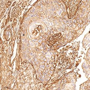 | IHC检测Integrin beta 1蛋白(货号 GB115173). 样品: 人食管癌, 4%多聚甲醛 (货号G1101) 固定12-24小时. 抗原修复: 柠檬酸抗原修复液(干粉, pH 6.0) (G1201), 98℃, 20分钟. —抗: 1: 300稀释, 4℃ 孵育过夜. 二抗: HRP标记山羊抗兔IgG (H+L) (货号GB23303), 1: 200稀释, 室温孵育1小时. |
