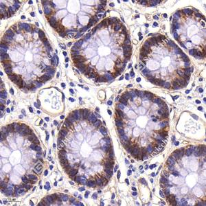 | IHC检测Integrin beta 1蛋白(货号 GB115173). 样品: 人结肠, 4%多聚甲醛 (货号G1101) 固定12-24小时. 抗原修复: 柠檬酸抗原修复液(干粉, pH 6.0) (G1201), 98℃, 20分钟. —抗: 1: 300稀释, 4℃ 孵育过夜. 二抗: HRP标记山羊抗兔IgG (H+L) (货号GB23303), 1: 200稀释, 室温孵育1小时. |