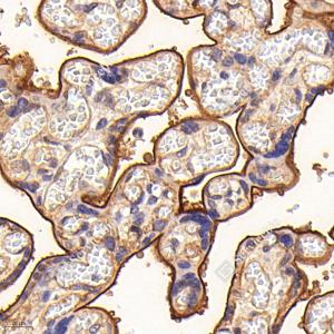 | IHC检测Integrin beta 1蛋白(货号 GB115173). 样品: 人胎盘, 4%多聚甲醛 (货号G1101) 固定12-24小时. 抗原修复: 柠檬酸抗原修复液(干粉, pH 6.0) (G1201), 98℃, 20分钟. —抗: 1: 300稀释, 4℃ 孵育过夜. 二抗: HRP标记山羊抗兔IgG (H+L) (货号GB23303), 1: 200稀释, 室温孵育1小时. |