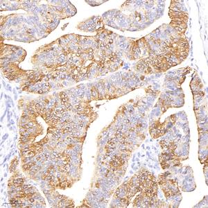 IHC检测MUC1/CD227蛋白(货号 GB115321). 样品: 人子宫内膜癌, 4%多聚甲醛 (货号G1101) 固定12-24小时. 抗原修复: 柠檬酸抗原修复液(干粉, pH 6.0) (G1201), 98℃, 20分钟. —抗: 1: 500稀释, 4℃ 孵育过夜. 二抗: HRP标记山羊抗兔IgG (H+L) (货号GB23303), 1: 200稀释, 室温孵育1小时. |