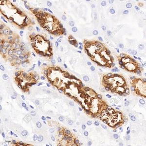 IHC检测MUC1/CD227蛋白(货号 GB115321). 样品: 人肾, 4%多聚甲醛 (货号G1101) 固定12-24小时. 抗原修复: 柠檬酸抗原修复液(干粉, pH 6.0) (G1201), 98℃, 20分钟. —抗: 1: 500稀释, 4℃ 孵育过夜. 二抗: HRP标记山羊抗兔IgG (H+L) (货号GB23303), 1: 200稀释, 室温孵育1小时. |