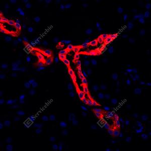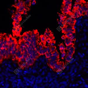 IF检测MUC1/CD227蛋白(货号 GB115321)(红色). 样品: 人肾, 4%多聚甲醛 (货号G1101) 固定12-24小时. 抗原修复: Tris-EDTA抗原修复液(pH 9.0) (G1203), 98℃, 20分钟. 封闭: 3% BSA(货号GC305010)的PBS溶液, 室温孵育30分钟. —抗: 1: 500稀释, 4℃ 孵育过夜. 二抗: Cy3标记山羊抗兔IgG (H+L) (货号GB21303), 1: 300稀释, 室温孵育1小时. |